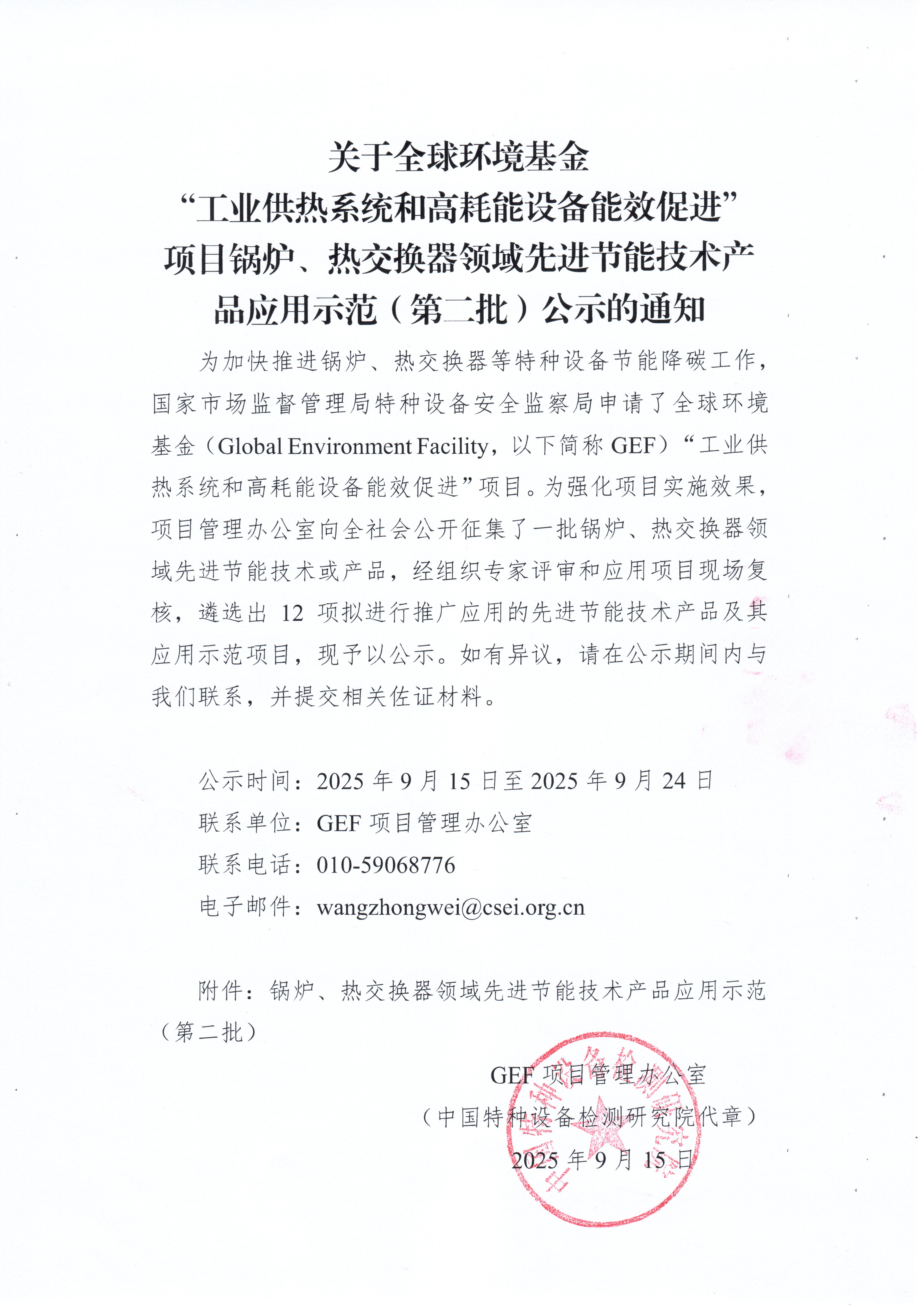 关于全球环境基金 “工业供热系统和高耗能设备能效促进” 项目锅炉、热交换器领域先进节能技术产品应用示范(第二批)公示的通知