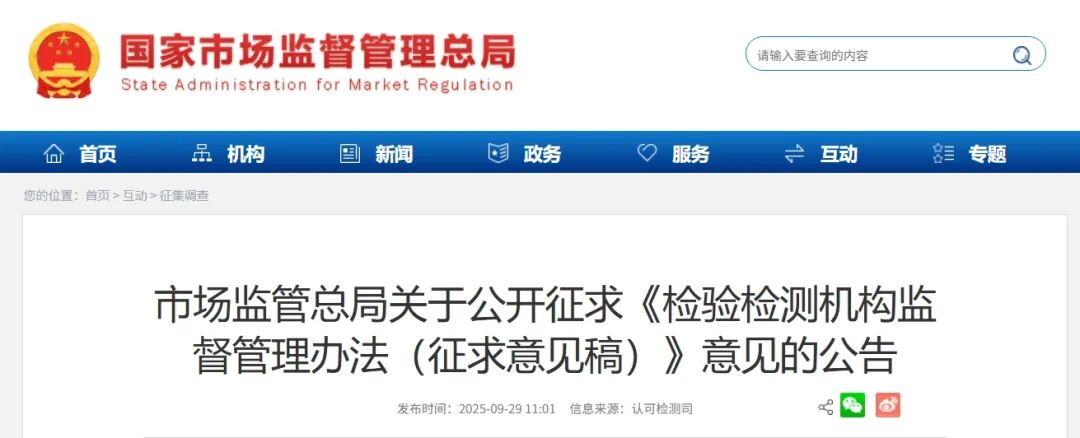 为深入贯彻落实党中央、国务院决策部署,进一步强化检验检测行业管理,规范检验检测市场秩序,促进行业持续健康发展,市场监管总局启动《检验检测机构监督管理办法》修订工作,组织起草了《检验检测机构监督管理办法(征求意见稿)》,现向社会公开征求意见。公众可通过以下途径和方式提出意见: