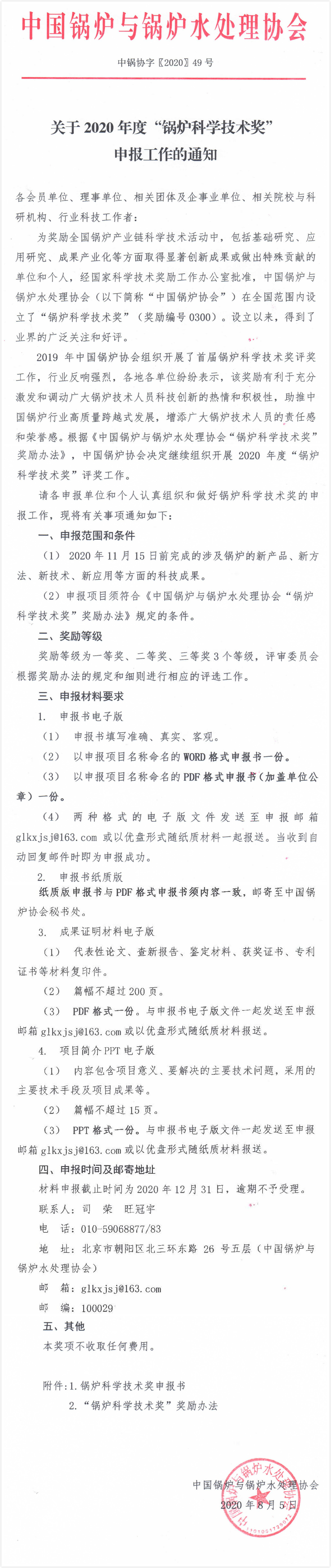 关于2020年度“锅炉科学技术奖”申报工作的通知